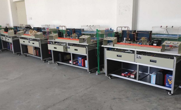 系統(tǒng)由兩部分組成,分別為:分體式熱泵空調(diào)和直冷電冰箱,分體空調(diào)可進(jìn)行制冷、制熱、除濕、自動工作模式功能,直冷式電冰箱可進(jìn)行冷藏、冷凍等功能,涵蓋了制冷專業(yè)中所涉及的安裝、管路設(shè)計(jì)焊接技術(shù)、接線、保壓、檢漏、抽真空、充注制冷劑、制冷劑回收、運(yùn)行調(diào)試,控制電路故障考核等。本裝置應(yīng)適合機(jī)電、動力工程類專業(yè)的實(shí)訓(xùn),適合制冷及相關(guān)專業(yè)的中級、高級工的技能鑒定及考核。