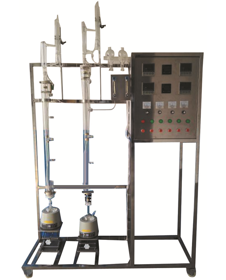 1、雙玻璃填料塔,塔體直徑φ20mm,塔1:高1400mm,塔2:高1200mm。不銹鋼φ2×2mmθ網(wǎng)環(huán)填料,塔體外壁二段透明導(dǎo)電膜加熱保溫(手動控制)塔釜容積500ml。雙塔可獨立操作。 2、雙預(yù)熱器與控溫系統(tǒng),溫度與塔頂回流自控,塔頂、塔釜測溫獨立數(shù)字顯示。 3、塔1:五側(cè)口,塔2:無側(cè)口,塔體外壁2段導(dǎo)電膜加熱保溫(手動控制),塔1和塔2均有溫度與回流自控,塔1和塔2的塔頭為蛇管冷凝器,擺錘式回流結(jié)構(gòu)和蛇管冷凝器油水分相器結(jié)構(gòu)。 4、蠕動泵2臺,外控功能:轉(zhuǎn)速控制,方向控制,啟?刂啤^D(zhuǎn)速范圍:0.1-100rpm。轉(zhuǎn)速分辨率:0.1rpm。流量范圍: 0.07-380ml/min。 5、250ml高位玻璃加料瓶,LZB--2轉(zhuǎn)子流量計:流量范圍2.5~25ml/min ,數(shù)量2套。 6、真空系統(tǒng):含真空泵、緩沖罐,閥門、壓力計等。 7、宇電AI518溫度控制儀,宇電AI704M溫度巡檢儀。 8、各項操作及溫度、回流比、流量的顯示、調(diào)節(jié)、控制全在控制屏面板進行。 9、框架為304不銹鋼材質(zhì),結(jié)構(gòu)緊湊,外形美觀,流程簡單、操作方便。 10、外形尺寸:1500×600×2200mm(長×寬×高),拋光不銹鋼框架,帶剎車輪。 |