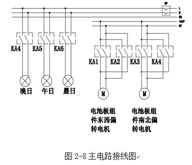 按照接線圖鏈接線路,控制兩軸聯(lián)動系統(tǒng)追蹤最佳發(fā)電位置。Plc接線圖在附表5.1,通過plc程序控制電機和燈完成最佳位置跟蹤。主電路接線圖如圖2-8所示: