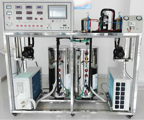 熱泵-壓縮機(jī)性能實(shí)驗(yàn)裝置采用熱平衡法測(cè)量熱泵與制冷壓縮機(jī)的性能。系統(tǒng)主要由制冷壓縮機(jī)、蒸發(fā)器、冷凝器、恒溫水箱和電子膨脹閥等組成。采用傳感器和檢測(cè)儀表采集蒸汽壓縮式制冷循環(huán)過(guò)程中的溫度、壓力、流量、壓縮機(jī)功率、電流、頻率等狀態(tài)參數(shù),經(jīng)自行研制的數(shù)據(jù)采集板卡連接到計(jì)算機(jī),基于面向?qū)ο蠹夹g(shù)開(kāi)發(fā)的具有實(shí)時(shí)性高,界面設(shè)計(jì)人性化等特點(diǎn)的測(cè)控軟件實(shí)現(xiàn)熱力循環(huán)過(guò)程實(shí)時(shí)動(dòng)態(tài)顯示、性能參數(shù)測(cè)試和計(jì)算,構(gòu)成具有檢測(cè)、分析、記錄、測(cè)試、繪圖等多功能一體化的熱泵-壓縮機(jī)性能實(shí)驗(yàn)系統(tǒng);诨A(chǔ)型機(jī)組,增加如下內(nèi)容:學(xué)生設(shè)計(jì)型與創(chuàng)新型實(shí)驗(yàn)。