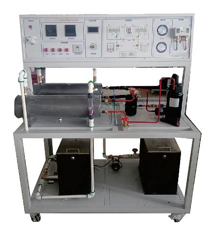 水冷式機(jī)組,配備全封閉式制冷壓縮機(jī)、冷凝器、蒸發(fā)器等制冷系統(tǒng)真實(shí)部件,并設(shè)有智能溫度調(diào)節(jié)儀、流量計(jì)、壓力表、電壓表、電流表等測(cè)量?jī)x表。