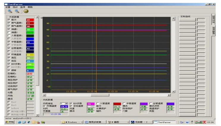 2)軟件控制,能在線控制系統(tǒng)的溫度,讀取機(jī)組在最佳溫度系統(tǒng)制冷冷媒的流量開度數(shù),調(diào)整制冷機(jī)組的過熱度,過冷度。該文本顯示界面的左側(cè),以文本的形式實(shí)時(shí)顯示當(dāng)前機(jī)組的運(yùn)行數(shù)據(jù)。在界面右側(cè)的上半部分,是對通訊信息的顯示,包括通訊角色及通訊端口的設(shè)定值以及對當(dāng)前通訊狀態(tài)的顯示。在界面右側(cè)的下半部分“數(shù)據(jù)信息”中,顯示當(dāng)前接收到哪種數(shù)據(jù)幀、接收到的數(shù)據(jù)幀的地址、等信息。具有上位機(jī)調(diào)節(jié)的線上和手動(dòng)調(diào)節(jié)功能: