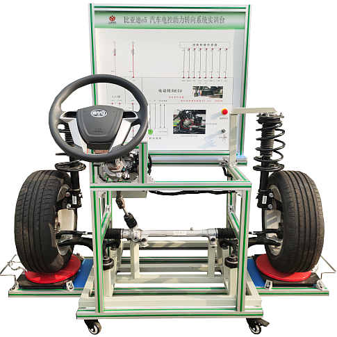 (比亞迪e5 EV450純電動汽車) 動力轉(zhuǎn)向控制電腦(ECU)、診斷座、點火開關(guān)、前橋懸掛機構(gòu)、方向盤、轉(zhuǎn)向柱、電動助力方機、轉(zhuǎn)向拉桿、前左右車輪總成、信號模擬裝置、扭矩傳感器、扭矩傳感器信號電壓數(shù)顯表、故障模擬與排除裝置、前輪左右轉(zhuǎn)盤、一體化全鋁合金型材搭建的移動臺架(1500×1000×1700mm ,帶自鎖腳輪裝置,帶安裝檢測端子的原理面板948×898mm)、設(shè)備操作說明書。
