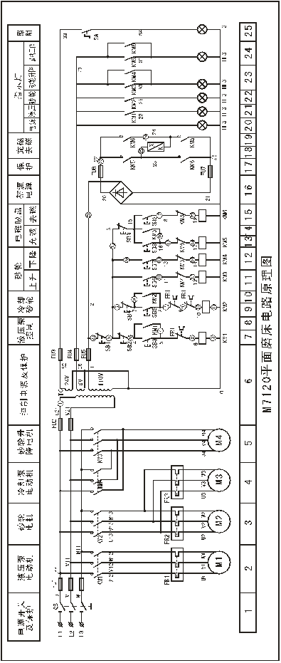 主電路共有四臺電動機,其中M1是液壓泵電動機,它驅(qū)動液壓泵進行液壓傳動,實現(xiàn)工作臺和砂輪的往復運動;M2是砂輪電動機,它帶動砂輪轉(zhuǎn)動來完成磨削加工工件;M3是冷卻泵電