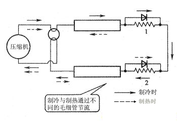 如下圖所示。某些熱泵型空調(diào)器有兩組毛細管和兩個單向閥,空調(diào)器制冷時,只有毛細管2參與節(jié)流,毛細管1被單向閥1短路?照{(diào)器制熱時只有毛細管l參與節(jié)流,毛細管2被單向閥短路。因此。當只有毛細管1被堵塞時,雖然空調(diào)器制冷正常,但制熱時氣路被堵塞,空調(diào)器無法正常工作。