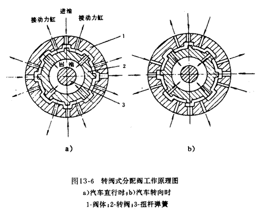 圖b)所示為汽車轉(zhuǎn)向時的情況。轉(zhuǎn)向盤轉(zhuǎn)動分配閥中央的扭桿彈簧3和轉(zhuǎn)閥2,再通過扭桿彈簧帶動閥體和轉(zhuǎn)向機螺桿,由于轉(zhuǎn)向阻力的作用,使扭桿彈簧發(fā)生扭轉(zhuǎn),造成閥體相對于轉(zhuǎn)閥轉(zhuǎn)過了一個角度,這樣就使進油口進入的壓力油只能流向轉(zhuǎn)閥和閥體縱槽槽肩處間隙變大的一邊,并通過閥體上的出油口流向接通了的動力缸的一側(cè)腔室,此時動力缸的另一側(cè)腔室就與進油口隔絕,其中的油液通過閥體內(nèi)另一組縱槽槽肩處間隙變大的另一邊,與轉(zhuǎn)閥的回油孔相通,形成了泄壓通道。這樣就造成了齒條--活塞的一側(cè)受到壓力油的作用,而另一側(cè)處于泄壓狀態(tài),這種壓力差就造成了助力作用。