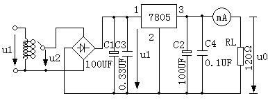 圖17-2 由7805構(gòu)成的串聯(lián)型穩(wěn)壓電源