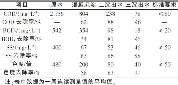 該工程經(jīng)過近半年的調(diào)試運(yùn)行后,兩級生化處理工藝中的污泥濃度均能達(dá)到設(shè)計值,出水水質(zhì)穩(wěn)定,各指標(biāo)能達(dá)到排放要求。進(jìn)、出水水質(zhì)及各單元去除率如表2所示。