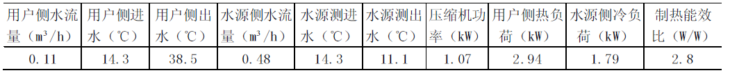 從表2中測(cè)試數(shù)據(jù)我們可以看出,制熱工況時(shí),由于冷凝溫度的提高,壓縮機(jī)輸入功比制冷時(shí)增加不少,同時(shí)冷凝器上產(chǎn)生的熱量也降低了不少,制熱能效比為2.8,即每輸入1kW電功率,產(chǎn)生了2.8kW的制熱量。