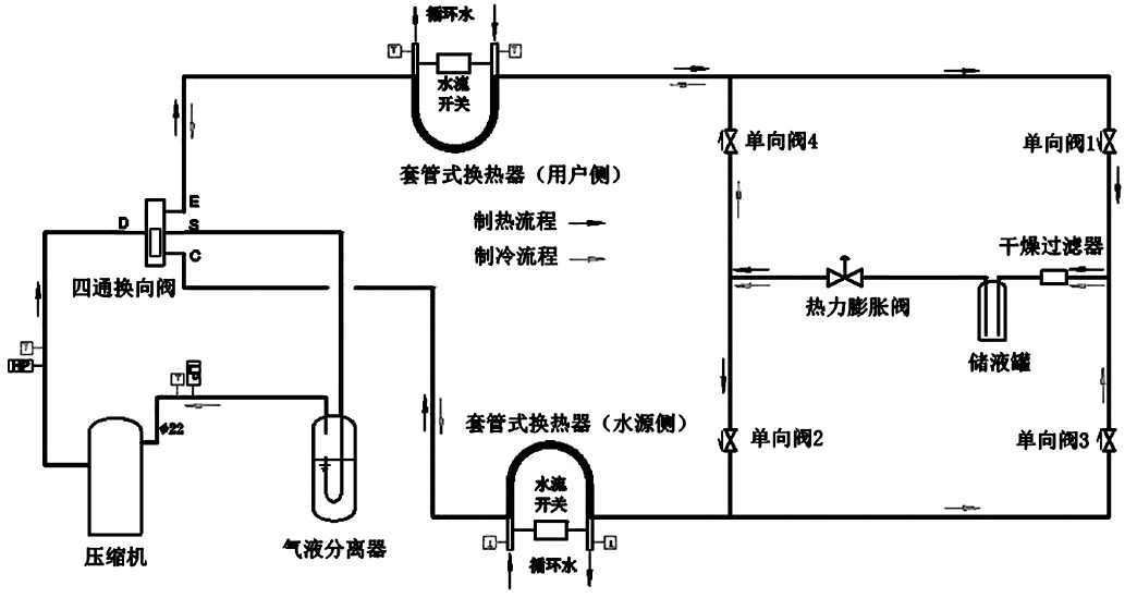本實(shí)驗(yàn)平臺(tái)水源熱泵制冷循環(huán)系統(tǒng)圖如圖1所示,由壓縮機(jī)、水源側(cè)套管換熱器、用戶側(cè)套管換熱器、熱力膨脹閥、氣液分離器、四通換向閥、干燥過(guò)濾器、儲(chǔ)液罐、單向閥等通過(guò)銅管連接組成。壓縮機(jī)起著壓縮和輸送循環(huán)工質(zhì)從低溫低壓到高溫高壓處的作用。蒸發(fā)器與冷凝器采用的是換熱效率較高的套管式換熱器,使制冷劑與水進(jìn)行高效換熱,制熱時(shí)水源側(cè)套管換熱器為蒸發(fā)器,用戶側(cè)套管換熱器為冷凝器,制冷時(shí)則相反。