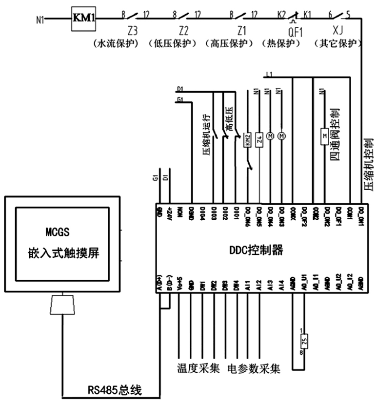 MCGS觸摸屏負(fù)責(zé)系統(tǒng)的算法運(yùn)算、指令輸出、數(shù)據(jù)存儲(chǔ)、曲線跟蹤、遠(yuǎn)程數(shù)據(jù)傳送等功能;DDC控制采集器主要功能是執(zhí)行指令控制設(shè)備的啟停狀態(tài)、設(shè)備的運(yùn)行狀態(tài)采集、溫度采集、壓力采集、水流量采集、電量參數(shù)采集等。