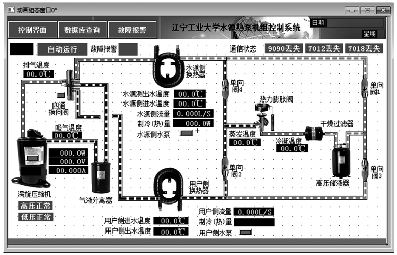 本實(shí)驗(yàn)平臺(tái)采用嵌入式觸摸屏與DDC控制器聯(lián)合控制系統(tǒng),嵌入式觸摸屏是控制系統(tǒng)的指揮中心,與下設(shè)的DDC設(shè)備進(jìn)行數(shù)據(jù)通信,指揮設(shè)備的控制運(yùn)行狀態(tài)及采集設(shè)備的運(yùn)行狀態(tài)參數(shù),并且實(shí)現(xiàn)友好的人機(jī)對(duì)話。DDC控制器主要負(fù)責(zé)現(xiàn)場(chǎng)水源熱泵機(jī)組的控制啟停和供回水溫度、制冷系統(tǒng)溫度、水流量、運(yùn)行狀態(tài)及電量參數(shù)監(jiān)測(cè)。