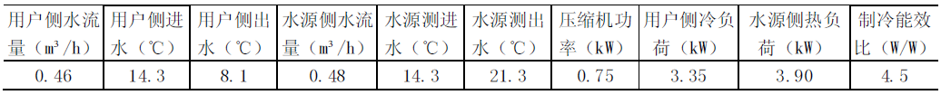 從表1中測(cè)試數(shù)據(jù)我們可以看出,制冷工況時(shí),由于冷凝溫度比較低,壓縮機(jī)輸入功耗也相對(duì)比較低,制冷能效比達(dá)到了4.5,即每輸入1kW電功率,產(chǎn)生了4.5kW的制冷量。