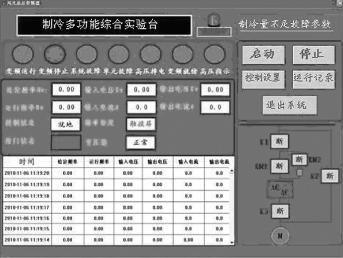 1) 制冷壓縮機(jī)效果差,表現(xiàn)在壓縮機(jī)工作時冷凝壓力上升和蒸發(fā)壓力下降,而安裝在冷凝器和蒸發(fā)器上的壓力表通過溫度傳感器反饋到計算機(jī),計算機(jī)的可視化界面會顯示當(dāng)時的蒸發(fā)壓力和冷凝壓力,超過設(shè)置的額定值,表明制冷量下降,圖2 為計算機(jī)控制界面圖形。