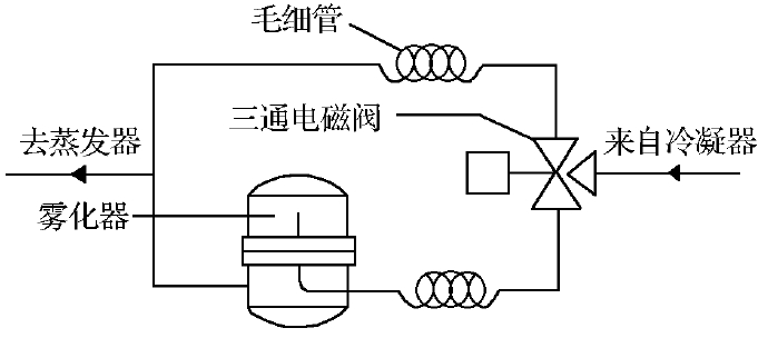 在冷凝器與蒸發(fā)器的管路之間并聯(lián)安裝霧化器,使制冷劑經(jīng)過霧化器,通過三通電磁閥來改變制冷劑流向,完成制冷劑在霧化器內(nèi)的冷凝與蒸發(fā)可視化,圖3為霧化器的安裝圖。此外,研制過程中在制冷系統(tǒng)的關(guān)鍵部位安裝透明石英管路,實現(xiàn)制冷劑動態(tài)可視化。