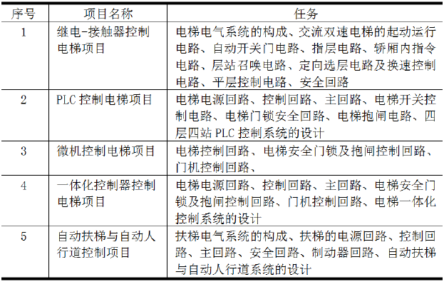 根據(jù)企業(yè)對電梯電氣控制系統(tǒng)產(chǎn)品的設(shè)計(jì)和開發(fā)流程,結(jié)合電梯專業(yè)教學(xué)標(biāo)準(zhǔn)要求的主要學(xué)習(xí)內(nèi)容,本課程設(shè)計(jì)的教學(xué)項(xiàng)目如表1所示。
