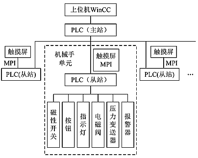 如圖3 所示,整個控制系統(tǒng)由觸摸屏、PLC、電磁閥、磁性開關(guān)、壓力變送器、指示燈、報警器等元器件組成。PLC控制系統(tǒng)設(shè)計中,采用主站加從站的分布式控制模式,其功能分別是實現(xiàn)從站之間的數(shù)據(jù)通信,以及對各自控制單元的控制。在系統(tǒng)實現(xiàn)過程中,監(jiān)控中心設(shè)置上位機(jī),在上位機(jī)上基于WinCC 開發(fā)了對控制系統(tǒng)進(jìn)行實時監(jiān)控的監(jiān)控系統(tǒng),不同的從站點分別設(shè)置相應(yīng)的觸摸屏,以達(dá)到實時監(jiān)控與顯示控制單元控制狀態(tài)的目的,機(jī)械手單元的控制系統(tǒng)選擇的是從站PLC + 觸摸屏的模式,前者可實現(xiàn)系統(tǒng)控制邏輯關(guān)系,后者則是方便