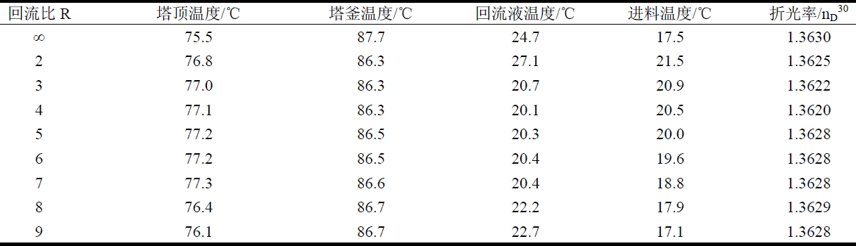 表2 調(diào)節(jié)不同回流比時塔頂餾分折光率