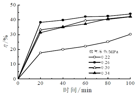 溶氣壓力是氣浮工藝中一個重要操作參數(shù),首先采用不同溶氣壓力進行除油實驗,分析其對除油率的影響。實驗采用污水初始含油濃度為1000mg/L,溶氣壓力分別為0.22、0.26、0.30、0.34MPa。不同溶氣壓力下除油率隨時間變化如圖1 所示。由圖1 可知,0至20min除油率變化最顯著, 20min以后除油率增大速率減緩,60min后除油率基本不再發(fā)生改變。溶氣壓力由0.22MPa增大至0.26MPa時,最終除油率由30%左右升高至40%以上。而溶氣壓力在0.26MPa至0.34MPa變化時,最終除油率基本不再發(fā)生改變。在實際應(yīng)用中,提高溶氣壓力伴隨著能耗的增加,但分離效率不再增大,所以實際操作過程中溶氣壓力并非越大越好,需確定最合理的溶氣壓力。