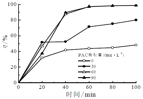 不同濃度聚合氯化鋁(PAC,分析純)對除油率變化的影響如圖3所示。加入30mg/L聚合氯化鋁,除油率明顯提高,PAC投加量增大至60mg/L時,最終除油率達到98%以上,繼續(xù)增大PAC投加量無法進一步提高除油效率。