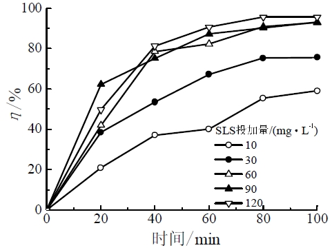 不同表面活性劑十二烷基硫酸鈉(SLS,分析純)濃度下除油效率隨時間的變化趨勢見圖4。由圖4 可知,隨SLS質(zhì)量濃度由10mg/L增大至60mg/L,最終除油率由60%左右提高到90%以上。此后,除油效率不再隨SLS濃度的增大而提高。