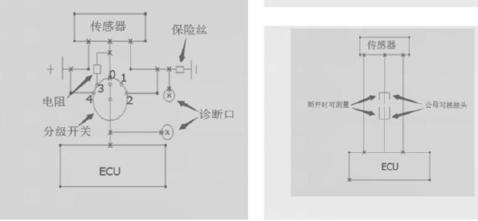 本項目基于這種故障設(shè)置思路,把每一個需要設(shè)置故障的傳感器或者執(zhí)行器等工作元件分別接入分級多檔位開關(guān),最后通過引線把他們集中起來,做成故障設(shè)置盒,方便教學使用。