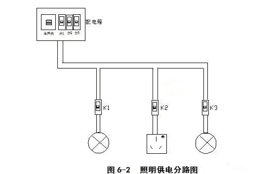 如圖所示6-2所顯示,合上總閘,先后蓋上分電源開關(guān)(分1、分2、分3),合上負(fù)荷電源開關(guān)K1、K2、K3,當(dāng)合上某一負(fù)荷電源開關(guān),燈沒(méi)亮或電源插座無(wú)電時(shí),則該環(huán)路為短路。一般搜索方式 參照附則五。