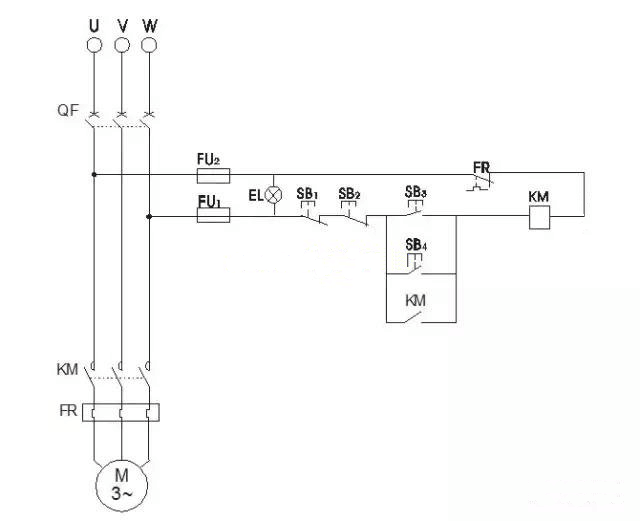 從電源開(kāi)關(guān)下邊W相考慮接斷路器FU1 FU1的小組出線線接常閉按鍵SB1 SB1的小組出線線接常閉按鍵SB2 SB2的小組出線線接開(kāi)與關(guān)按鍵SB3 SB3的小組出線線接至交流接觸器電磁線圈KM KM的小組出線線接熱繼器常閉點(diǎn)FR的9六號(hào) FR的小組出線端95號(hào)引至斷路器FU2 FU2的小組出線線接U相;將開(kāi)與關(guān)按鍵SB4并在開(kāi)與關(guān)按鍵SB3兩邊;將交流接觸器延時(shí)繼電器KM并在開(kāi)與關(guān)按鍵SB4兩端;最終接顯示燈。