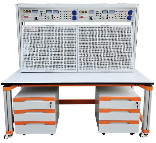 5、實(shí)訓(xùn)桌為鐵質(zhì)雙層亞光密紋噴塑與鋁合金結(jié)構(gòu),桌面為防火、防水、耐磨高密度板,結(jié)構(gòu)堅固,造型美觀大方,桌子左右有抽屜,下部有元件儲存柜,帶自鎖腳輪裝置,移動靈活,安全可靠、堅固耐用。