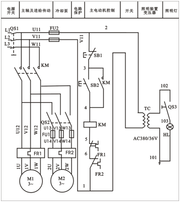 ,接觸器KM的線圈通電而鐵心吸合,主回路中接觸器KM的三個常開觸頭合上,主電機M1得到三相交流電而起動運轉,同時接觸器KM的常開輔助觸頭也合上,對控制回路進行自鎖,保證起動按鈕SB2松開時,接觸器KM的線圈 仍然通電。若加工時需要冷卻,則撥動開關QS2,讓冷卻泵電動機M2通電運轉,帶動冷卻泵供應冷卻液。