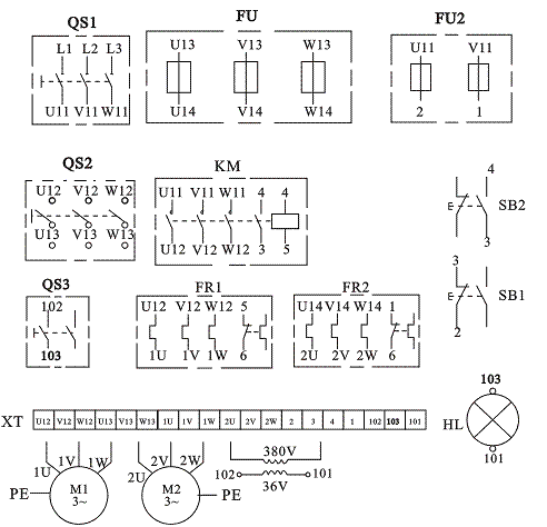 | M1、M2 | 三相鼠籠異步電動機 |