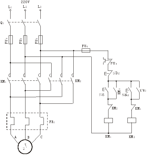圖1 倒順開關(guān)正反轉(zhuǎn)控制線路