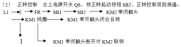 在掛箱上選定QS、FU1、FU2、KM1、KM2、FR、SB1、SB2、SB3及XT等器件。接線按圖11(C)所畫的連續(xù)線表示的單元接線圖接線,其中動力電路用黑色線,交流控制電路用紅色線,實(shí)線表示明配線,虛線表示暗配線(即板后接線),安裝與接線后應(yīng)符合第二章2-1的要求。