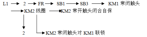 (2)反轉(zhuǎn)控制 要使電動機(jī)改變轉(zhuǎn)向(即由正轉(zhuǎn)變?yōu)榉崔D(zhuǎn))時,應(yīng)先按下停止按鈕SB1,使正轉(zhuǎn)控制電路斷開,電動機(jī)停轉(zhuǎn),然后才能使電動機(jī)反轉(zhuǎn),為什么要這樣操作呢?因?yàn)榉崔D(zhuǎn)控制回路中串聯(lián)了正轉(zhuǎn)接觸器KM1的常閉觸頭。當(dāng)KM1通電工作時,它是斷開的,若這時直接按反轉(zhuǎn)按鈕SB3,反轉(zhuǎn)接觸器KM2是無法通電的,電動機(jī)也就得不到電源,故電動機(jī)仍然處在正轉(zhuǎn)狀態(tài),不會反轉(zhuǎn),當(dāng)先按下停止按鈕SB1,使電動機(jī)停轉(zhuǎn)以后,再按下反轉(zhuǎn)按鈕SB3,電動機(jī)才會反轉(zhuǎn)。這時,反轉(zhuǎn)控制線路為: