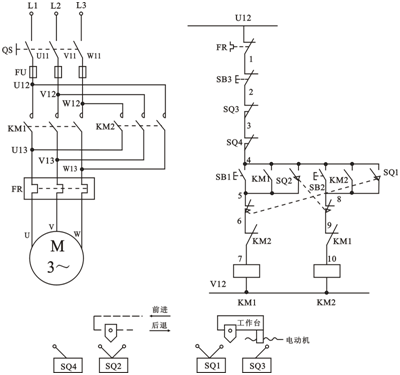 圖中的SQ3和SQ4分別安裝向右或向左的某個(gè)極限位置上。如果SQ1或SQ2失靈時(shí),工作臺(tái)會(huì)繼續(xù)向右或向左運(yùn)動(dòng),當(dāng)工作臺(tái)運(yùn)行到極限位置時(shí),撞塊就會(huì)碰撞SQ3和SQ4,從而切斷控制線路,迫使電動(dòng)機(jī)M停轉(zhuǎn),工作臺(tái)就停止移動(dòng)。SQ3和SQ4這里實(shí)際上起終端保護(hù)作用,因此稱為終端保護(hù)開(kāi)關(guān)或簡(jiǎn)稱終端開(kāi)關(guān)。