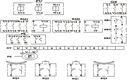 電機(jī)都能正常正反轉(zhuǎn)。若撥動(dòng)SQ3或SQ4極限位置開(kāi)關(guān)則電機(jī)應(yīng)停轉(zhuǎn)。若不符合上述控制要求,則應(yīng)分析并排除故障。