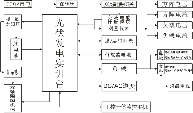 本產品是集光伏、光電、負載實驗于一體的太陽能發(fā)電教學實訓系統(tǒng)。除可完成常規(guī)光伏、光電轉換的相關實驗外,即可對阻性、感性負載進行實驗及教學演示。可以幫助學生,進一步理解太陽能發(fā)電系統(tǒng)的原理學習和工程實際應用技能。