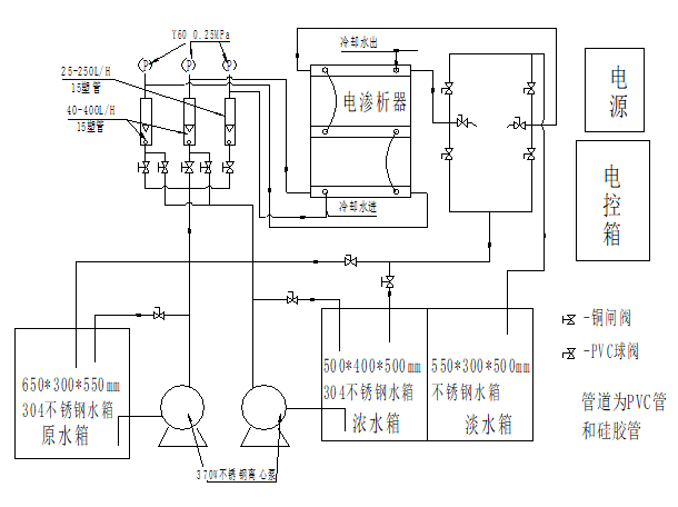 本裝置主要由PVC水箱、有機(jī)玻璃過濾柱、進(jìn)水泵、電滲析器、電氣控制箱和不銹鋼架等組成。