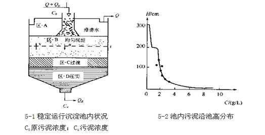 澄清濃縮池在連續(xù)穩(wěn)定運(yùn)行中,池內(nèi)可分為四區(qū),5-1所示。池內(nèi)污泥濃度沿著池高的分布狀況如圖5-2。