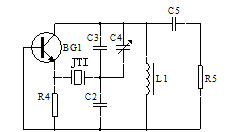 一種晶體振蕩器的交流通路如圖4-1所示。圖中,若將晶體短路,則L1、C2、C3就構(gòu)成了典型的電容三點(diǎn)式振蕩器(考畢茲電路)。因此,圖4-1的電路是一種典型的串聯(lián)型晶體振蕩器電路(共基接法)。若取L1=4.3μH、C2=820pF、C3=180pF,則可算得LC并聯(lián)諧振回路的諧振頻率f0≈6MHz,與晶體工作頻率相同。圖中, C5是耦合(隔直流)電容,R5是負(fù)載電阻。很顯然,R5越小,負(fù)載越重,輸出振蕩幅度將越小。