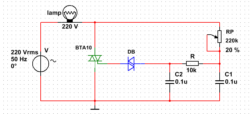 方案一:基于硬件電路的可調(diào)導(dǎo)通角。220V交流電源直接通過燈泡、電阻R、RP對電容C2充電,當(dāng)C兩端電壓達到雙向觸發(fā)管DB的導(dǎo)通電壓時,雙向觸發(fā)管導(dǎo)通,雙向可控硅BTA10也同時被觸發(fā)導(dǎo)通,燈泡lamp點亮。調(diào)節(jié)RP能改變C2的充/放電時間常數(shù),因而改變觸發(fā)脈沖的長短,改變了BTA10的導(dǎo)通角(導(dǎo)通程度),達到調(diào)節(jié)燈泡亮度的目的。