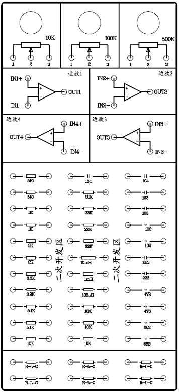 在布局圖中:提供了電位器3個(gè),運(yùn)放單元4個(gè),固定電阻18個(gè)、固定電容12個(gè)、固定電感3個(gè),及R-L-C插件6個(gè),可根據(jù)需要插上不同的電阻、電容或電感。