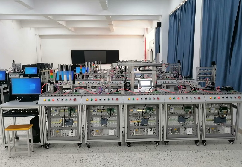 一、建設目標 結合學院當前和未來的發(fā)展規(guī)劃目標,本次規(guī)劃設計的工業(yè)機器人技能技能工作室能達到以下目標: --具備能夠滿足各專業(yè)教學實訓的基本技能、綜合技能、創(chuàng)新技能,以及中級、高級、技師、高級技師的職業(yè)資格和人才培養(yǎng)的需求。 --具備能夠滿足現代先進技術并緊密結合先進制造業(yè)技術發(fā)展的新工藝、新知識、新技能、新任務的需求。 --具備能夠滿足緊缺人才培訓,高技能人才培訓,農村勞動力轉移培訓,退役士兵培訓,職業(yè)能力轉換培訓等綜合培訓、鑒定的需求。 --具備能夠滿足國家骨干師資培訓,一體化教學師資培訓及其他雙師型師資培訓等綜合性師資培訓的需求。 --具備能夠滿足開展教學研討,開展技能競賽,開展學術交流,開展課程改革等等需要的多功能綜合性基地的需求。 規(guī)劃設計的一體化機電專業(yè)、電氣和自動化專業(yè)、工業(yè)自動化專業(yè)實訓基地的實訓裝備,本著實用性,實操性,職業(yè)性,綜合性為出發(fā)點,其技術優(yōu)勢如下: 技術的先進性 整套方案體現出現代制造業(yè)領域中所包含的PLC控制技術、網絡通信技術等先進控制理念及管理系統。 --技術的前瞻性 本套方案在基于現代控制理念的基礎上,突出體現現代制造業(yè)前沿科技的應知點及應會點,如工業(yè)機器人控制技術,智能監(jiān)控技術等。 技術的綜合性 集成了光、機、電、氣、液、網絡通信、數字控制等綜合技術的應用,完全覆蓋現有機電專業(yè)教學大綱及流行教材的訓練內容。 技術的職業(yè)性 方案所涉及的訓練內容,在滿足機電專業(yè)教學的前提下,結合相關工種的國家職業(yè)標準,既能進行培訓練習又能用于鑒定考核。 技術的可操作性訓練載體體現高起點、高科技、高技能的特點,該套方案配備了完整系統的解決措施,具備配套的課程體系、教學大綱、訓練教材及長期穩(wěn)定的師資培訓計劃。 技術的兼容性 該方案的技術來源于生產實際,不但能夠用于教學訓練,還能進行與生產實際相關的典型工作任務,使學校實訓與生產實際零距離接軌。 二、實訓項目 1.PLC認知實訓(軟硬件結構、系統組成、基本指令、接線、編程下載等) (一).PLC虛擬控制應用實訓 1.數碼顯示控制 2.搶答器控制 3.天塔之光控制 4.音樂噴泉控制 5.十字路口交通燈控制 6.水塔水位控制 7.自動送料裝車系統控制 8.四節(jié)傳送帶控制 9.裝配流水線控制 10.多種液體混合裝置控制 11.自動洗衣機控制 12.貨物分揀機控制 13.自動售貨機控制 (二).PLC實物控制應用實訓 14.視覺識別控制 15.RFID控制 16.長度定長控制 17.稱重控制 18.氣動基本回路控制 19.直線運動位置檢測、定位控制 20.步進電機定位控制 21.步進電機的速度控制 22.步進電機的正反轉控制 23.伺服電機定位控制 24.伺服電機的速度控制 25.伺服電機的正反轉控制 26.伺服電機和步進電機的綜合控制 (三).PLC、變頻器、觸摸屏綜合應用技能實訓 27.變頻器功能參數設置與操作 28.外部端子點動控制 29.變頻器控制電機正反轉 30.多段速度選擇變頻調速 31.變頻器無級調速 32.外部模擬量方式的變頻調速控制 33.基于PLC的變頻器外部端子的電機正反轉控制 34.基于PLC模擬量方式變頻開環(huán)/閉環(huán)調速控制 35.基于PLC通信方式的變頻開環(huán)調速 36.基于觸摸屏控制方式的基本指令編程練習 37.基于觸摸屏控制方式的數碼顯示控制 (四).網絡通訊綜合實訓 38.PLC與變頻器RS485通訊實訓 39.PLC、觸摸屏與變頻器通信控制 40.PLC主機之間PROFINET通訊實訓 41.PLC、變頻器、觸摸屏組網綜合應用實訓 42、PLC與RFID通訊控制 43、PLC與工業(yè)相機通訊 |