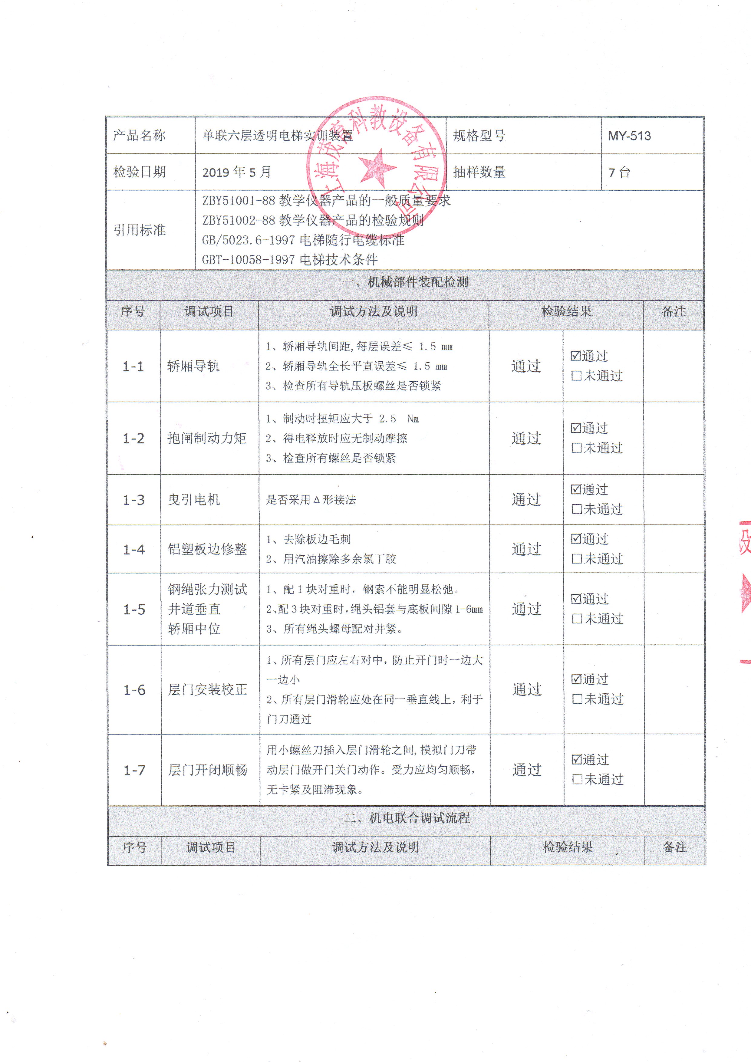透明教學(xué)電梯模型出廠檢測報(bào)告