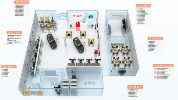 基礎(chǔ)建設(shè)設(shè)施:整體按4S店的模式進(jìn)行建設(shè),功能分區(qū)科學(xué)合理,分為銷售接待區(qū)、業(yè)務(wù)洽談區(qū)、售后服務(wù)區(qū)、整車檢測診斷區(qū)、汽車維修區(qū)等;