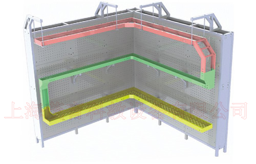 本系統(tǒng)采用仿真管槽安裝環(huán)境模型用200x60梯級橋架3米、100x50槽式橋架3米、100x50托盤式3米分上中下三層進(jìn)行安裝展示,配套有水平彎、三通、異徑接頭、堵頭等配件。