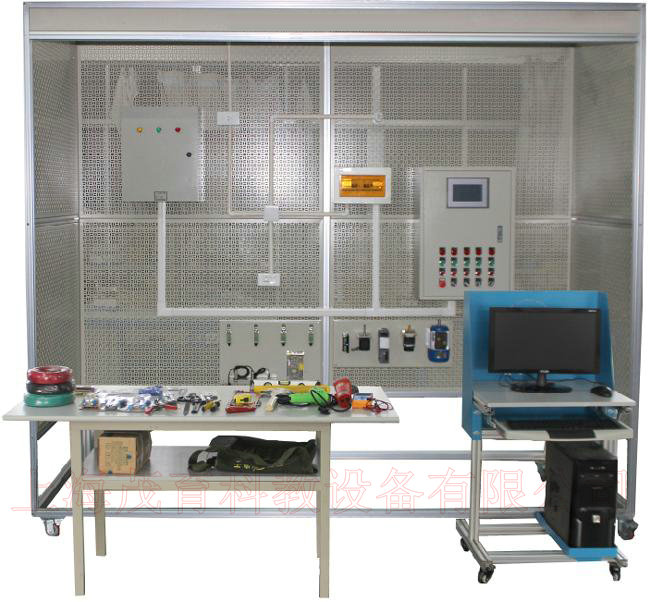 本設(shè)備可進行電工安裝。如橋架安裝、PVC管安裝、吊燈、白熾燈座、日光燈、開關(guān)、插座、配電箱、控制箱等,裝置還包含有交流異步電動機、直流電動機、步進電機、伺服電機、溫度控制器、電偶、PLC、變頻器觸摸屏。該系統(tǒng)每個操作組配套一可移動式工具車和元件柜,便于對元件的保管和安裝施工。從根本上解決了學(xué)校在普通墻面上進行的安裝培訓(xùn)的使用不方便、實訓(xùn)范圍窄的問題