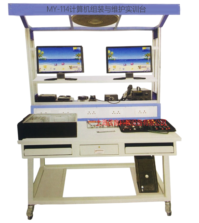 1、實訓臺:采用工業(yè)鋁合金型材框架,共兩層,其中第一層可放置維修工具、套件、儀器儀表;第二層可放顯示器,頂部設有30W日光燈一盞和風扇一臺。實訓臺設有一個抽屜、兩個鍵盤托架、兩個主機柜,下方有四個剎車的萬向輪。