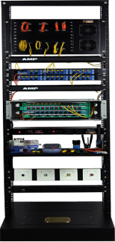 1)裝置選用19英寸開放式落地型機(jī)架,外形尺寸:長0.6米,寬0.53米,高1.8米。機(jī)架下部有4個(gè)地腳螺絲固定,保證設(shè)備牢固,能夠承受實(shí)訓(xùn)打線沖擊力。